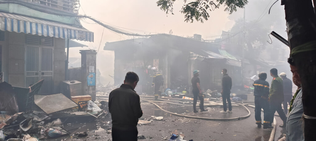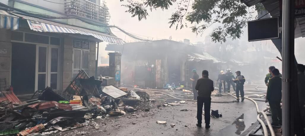 Chợ Xanh với hơn 100 ki-ốt trên phố Trần Nguyên Đán, phường Phương Liệt, bốc cháy ngùn ngụt, đe dọa nhiều nhà dân xung quanh, sáng 23/12.