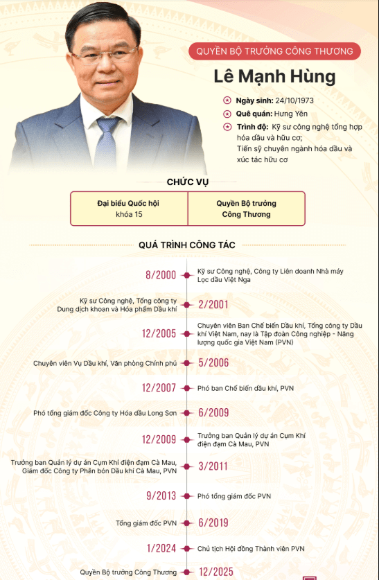 Ông Lê Mạnh Hùng, Chủ tịch Hội đồng thành viên Tập đoàn Công nghiệp – Năng lượng quốc gia Việt Nam (PVN), được Thủ tướng điều động về công tác tại Bộ Công thương, giao quyền Bộ trưởng Bộ Công Thương.