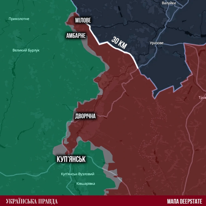 AFU đang phản công ở Kupyansk, với hy vọng tái chiếm thành phố. Trong khi đó, RFAF đang gây áp lực lên Milove và Vovchansk (Volchansk), cả 2 đều bị đối phương chiếm một phần hoặc toàn bộ.