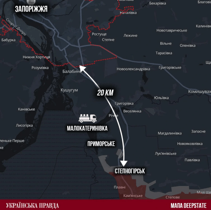 Có hai khu vực đột phá chính của RFAF tại Zaporizhia. Khu vực nhỏ hơn ở Stepnogorsk và Primorskoye, nơi giao tranh diễn ra ác liệt với sự xen kẽ giữa các cuộc tiến công của đối phương và phản công của những đơn vị thuộc Tổng cục Tình báo quốc phòng Ukraine (GUR). Mối nguy hiểm chính là việc đối phương tiếp cận Zaporizhia bằng UAV, buộc phải sơ tán bắt buộc nếu khoảng cách rút ngắn xuống còn 10km.