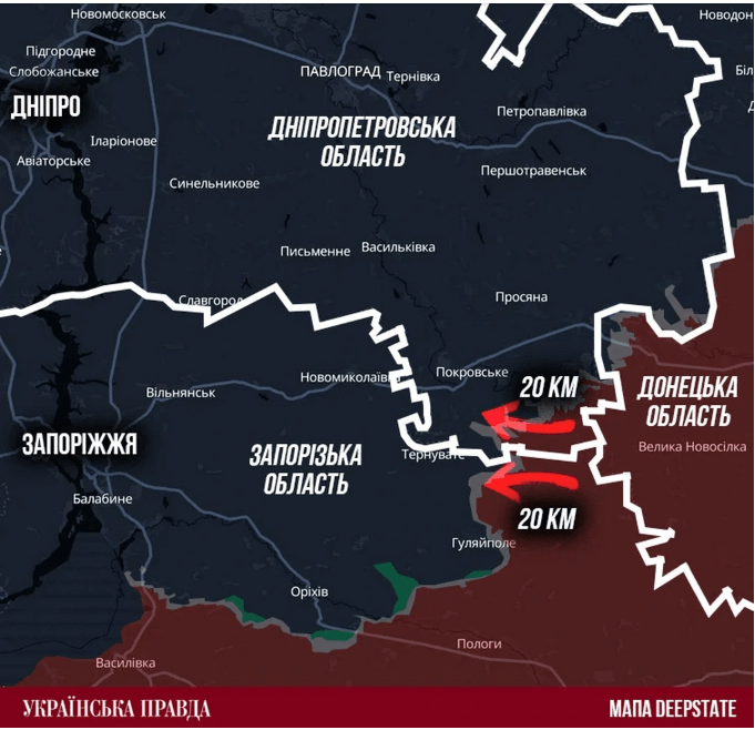 Hai hướng đột phá chính của Nga tại Dnipropetrovsk bao gồm khu vực phía nam Pokrovsk (Donetsk), nơi đối phương đang tiến về làng Mezhevaya để tạo vòng cung bao vây Pokrovsk và Dobropillia. Khu vực rộng hơn nằm gần Zaporizhia, tại các khu vực Novoselivka, Verbove, Veselovka và Yehorivka, với các làng Yehorivka và Danilovka là những điểm xa nhất trong cuộc tiến công, kéo dài gần 25km vào vùng Dnipropetrovsk.