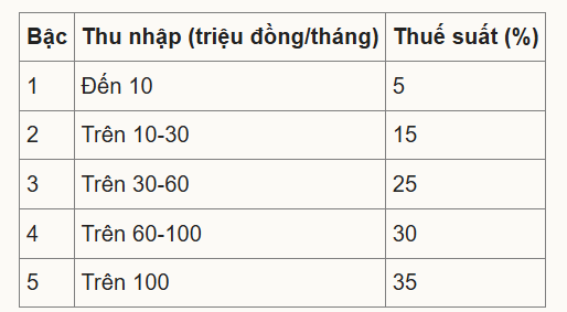 Theo đó, từ 1/7/2026, biểu thuế lũy tiến từng phần với thu nhập cá nhân giảm từ 7 bậc xuống còn 5 bậc và nới rộng khoảng cách giữa các bậc. Theo đó, mức thuế thấp nhất là 5% áp dụng với thu nhập đến 10 triệu đồng một tháng. Thuế suất cao nhất vẫn là 35% với thu nhập trên 100 triệu đồng, thay vì mức 80 triệu như hiện nay.