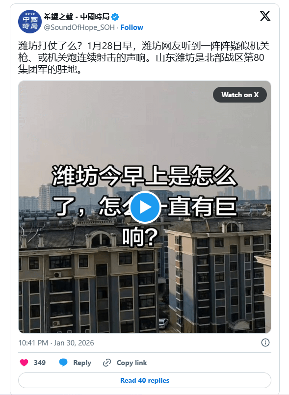 Sáng ngày 28/1, cư dân mạng tại thành phố Duy Phường, tỉnh Sơn Đông đã chia sẻ video trên Douyin cho thấy trên bầu trời địa phương xuất hiện những tiếng nổ lớn không xác định kéo dài. Có người nghi ngờ là tiếng pháo nổ, có người lại cảm thấy giống như tiếng súng máy hoặc pháo cao xạ bắn liên thanh. Được biết, Duy Phường là nơi đóng quân của Tập đoàn quân 80 thuộc Lục quân Chiến khu Bắc bộ, Lữ đoàn Tổng hợp 69 và Sư đoàn 5 Không quân của ĐCSTQ.