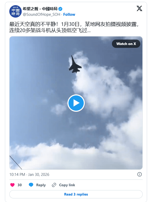 Ngày 30/1, một cư dân mạng tại một địa phương ở Trung Quốc quay được cảnh liên tiếp hơn 20 chiếc máy bay chiến đấu bay thấp ngay trên đầu. Cùng lúc đó, nhiều nơi tại Trung Quốc cũng ghi lại được hình ảnh xe quân sự di chuyển trên đường.