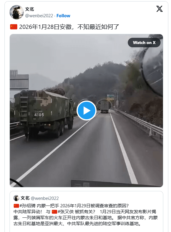 Cùng với thông báo chính thức về việc điều tra Phó Chủ tịch Quân ủy Trung ương Trung Quốc Trương Hựu Hiệp và Ủy viên Quân ủy Lưu Chấn Lập, gần đây có nguồn tin cho biết ông Trương đang bị giam giữ và tra tấn tại căn cứ huấn luyện của Cục Cảnh vệ Trung ương. Đồng thời, cư dân mạng Trung Quốc liên tục đăng tải video cho thấy máy bay và xe quân sự di chuyển bất thường, kèm theo tiếng súng pháo tại nhiều nơi. Đặc biệt, tại Duy Phường (tỉnh Sơn Đông) – nơi đóng quân của Tập đoàn quân 80 – đã vang lên những tiếng nổ lớn bí ẩn suốt 3 ngày liên tiếp.