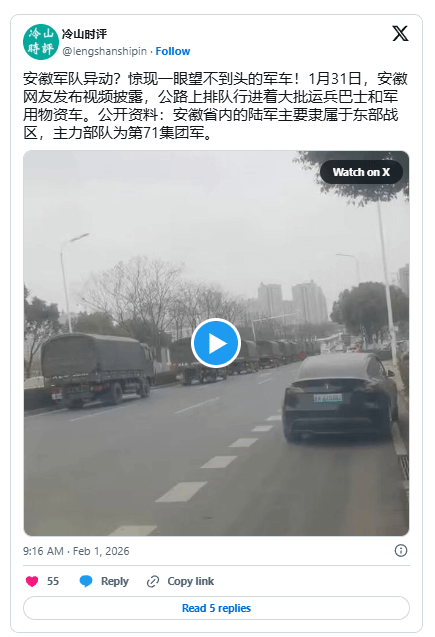 Ngày 31/1, cư dân mạng An Huy phát video tiết lộ trên quốc lộ có đoàn xe dài gồm xe buýt trắng chở quân nhân và xe tải quân sự phủ bạt xanh đang xếp hàng di chuyển. Lực lượng lục quân tại An Huy chủ yếu thuộc Chiến khu Đông bộ, đơn vị chủ lực là Tập đoàn quân 71.