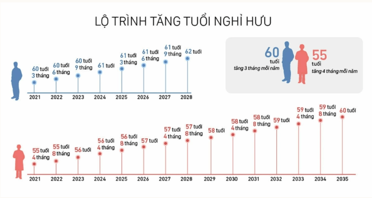 Bộ luật Lao động hiện hành quy định tuổi hưu của người làm việc trong điều kiện bình thường tăng lần lượt ba và bốn tháng cho đến khi đạt 62 tuổi với nam vào năm 2028 và 60 với nữ vào 2035. Từ ngày 1/1/2026, tuổi nghỉ hưu của nam là 61 tuổi 6 tháng, nữ là 57 tuổi.
