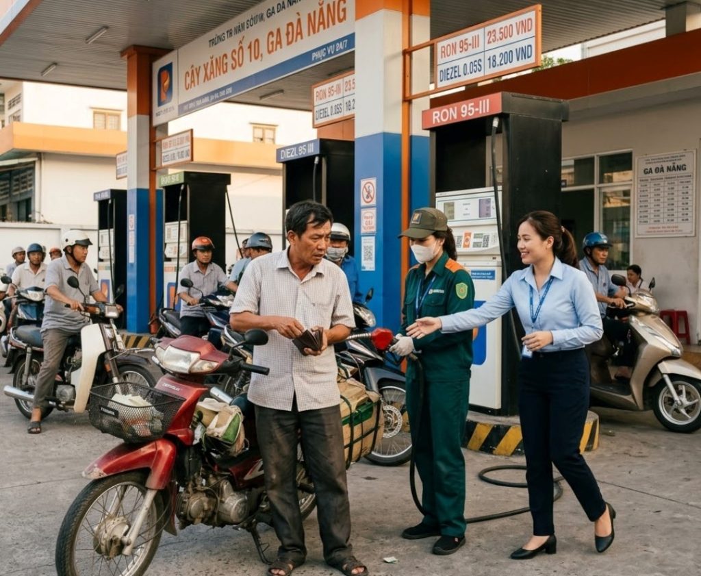 Một người đàn ông đi chiếc xe máy cũ kỹ, lục túi mãi không đủ tiền đổ xăng. Người phụ