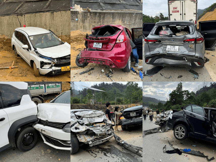 Sau va chạm ban đầu của xe tải biển Quảng Trị, nhiều ôtô không kịp xử lý đã tông nối