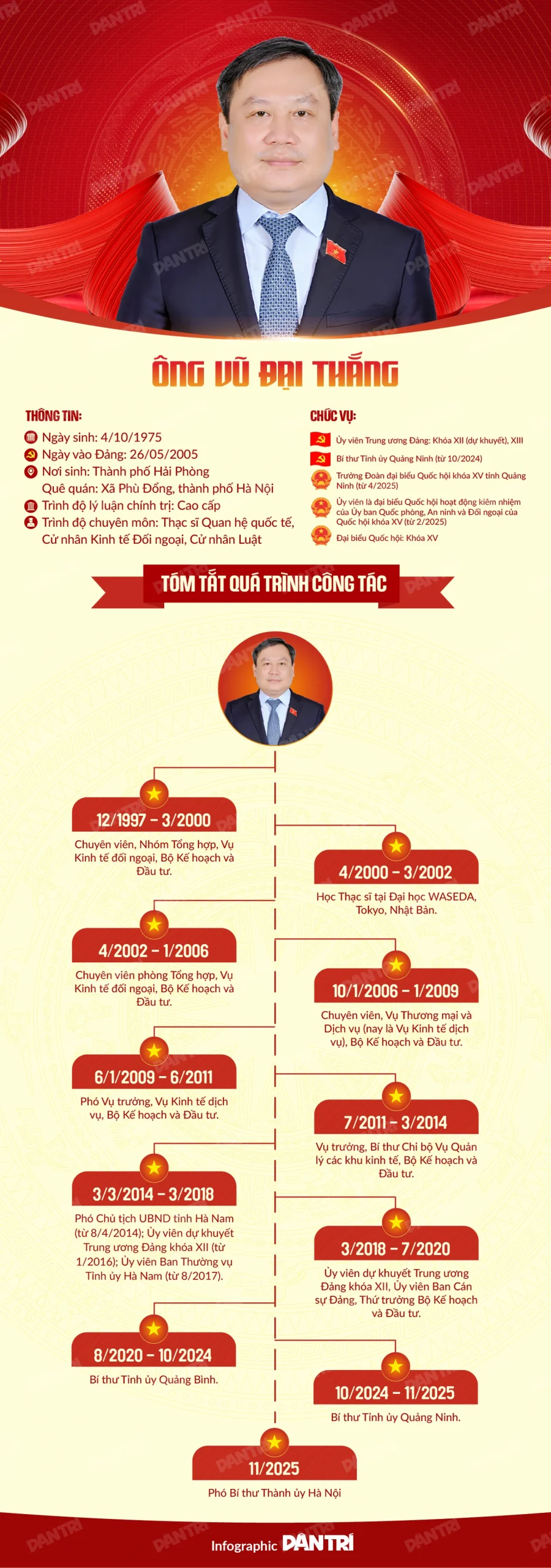 Cùng thời điểm, Bộ Chính trị quyết định điều động ông Vũ Đại Thắng từ vị trí Bí thư Tỉnh ủy Tỉnh ủy Quảng Ninh (vừa tái đắc cử nhiệm kỳ 2025–2030) sang Thành ủy Hà Nội, chỉ định làm Phó Bí thư Hà Nội nhiệm kỳ 2025–2030.